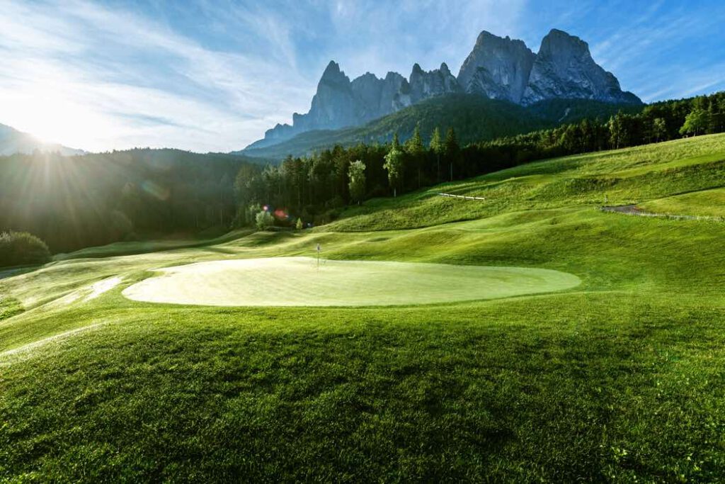 Die 18-Loch Golfanlage auf der Seiser Alm ist bestens gepflegt und die Greens in einem ausgezeichneten Zustand. Die Herausforderung ist aber nicht die Länge der Fairways sondern eher das strategische Spiel, abschüssige Hänge oder Felsen zu überspielen.