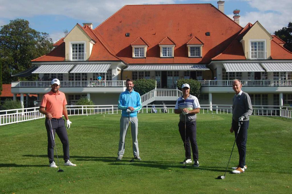 Foto „DSC_0101“: Die Teilnehmer starteten vor einer eindrucksvollen Clubhaus-Kulisse des Wittelsbacher Golfclub Rohrenfeld-Neuburg. Auf dem Bild v.l.n.re. V.li.n.re. Patrick Rahme (Golf Club Grand Ducal und CEO von Turnier-Presenting-Partner All Square), Steffen Kefer (GC Bad Wörishofen), Ergül Altinova (Geschäftsführer GMVD-Partner golf.extra) und Andreas Dorsch (GMVD-Geschäftsführer, CCM 2, 2019). (Foto: Robert M. Frank für GMVD)