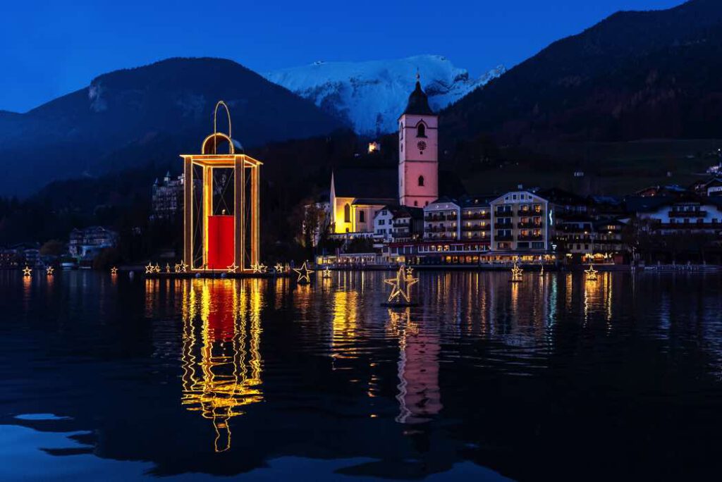 Wolfgangseer Advent – Blick auf St. Wolfgang mit Friedenslicht-Laterne (c) Wolfgangsee Tourismus